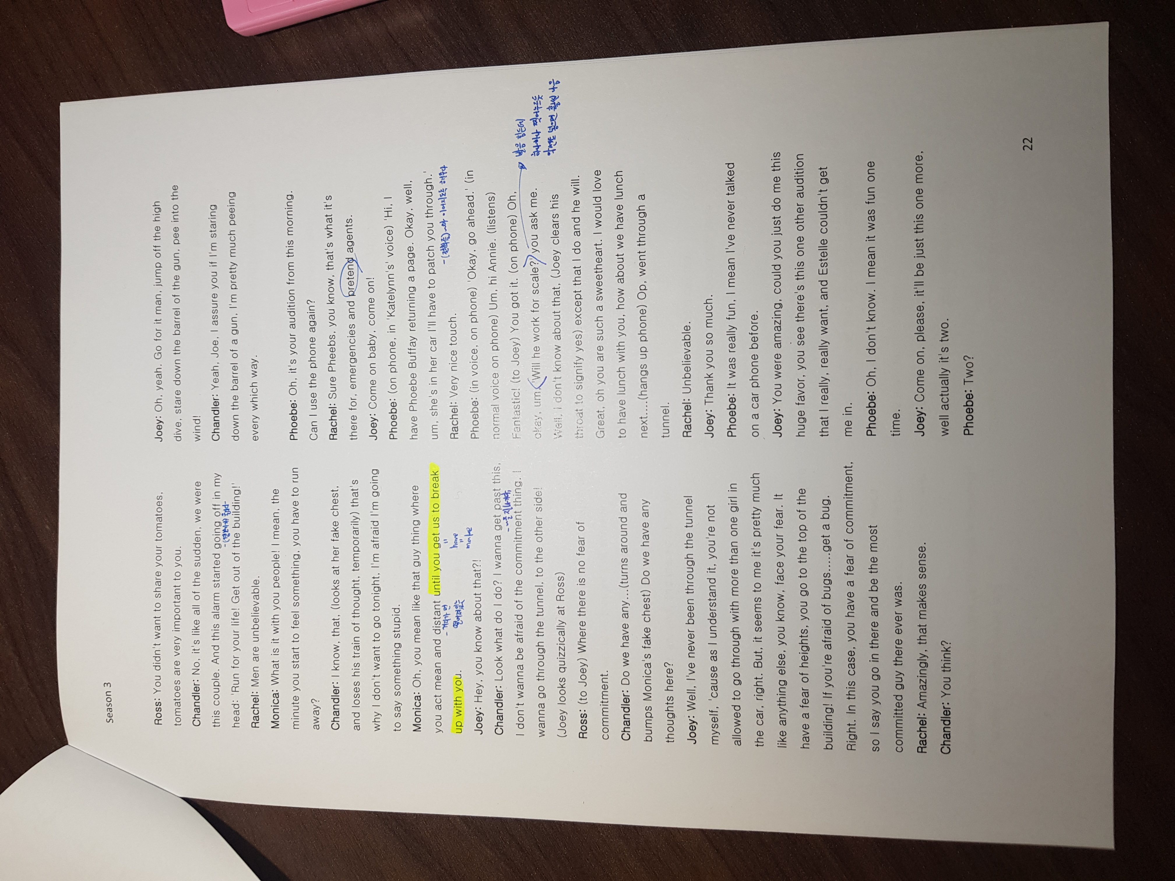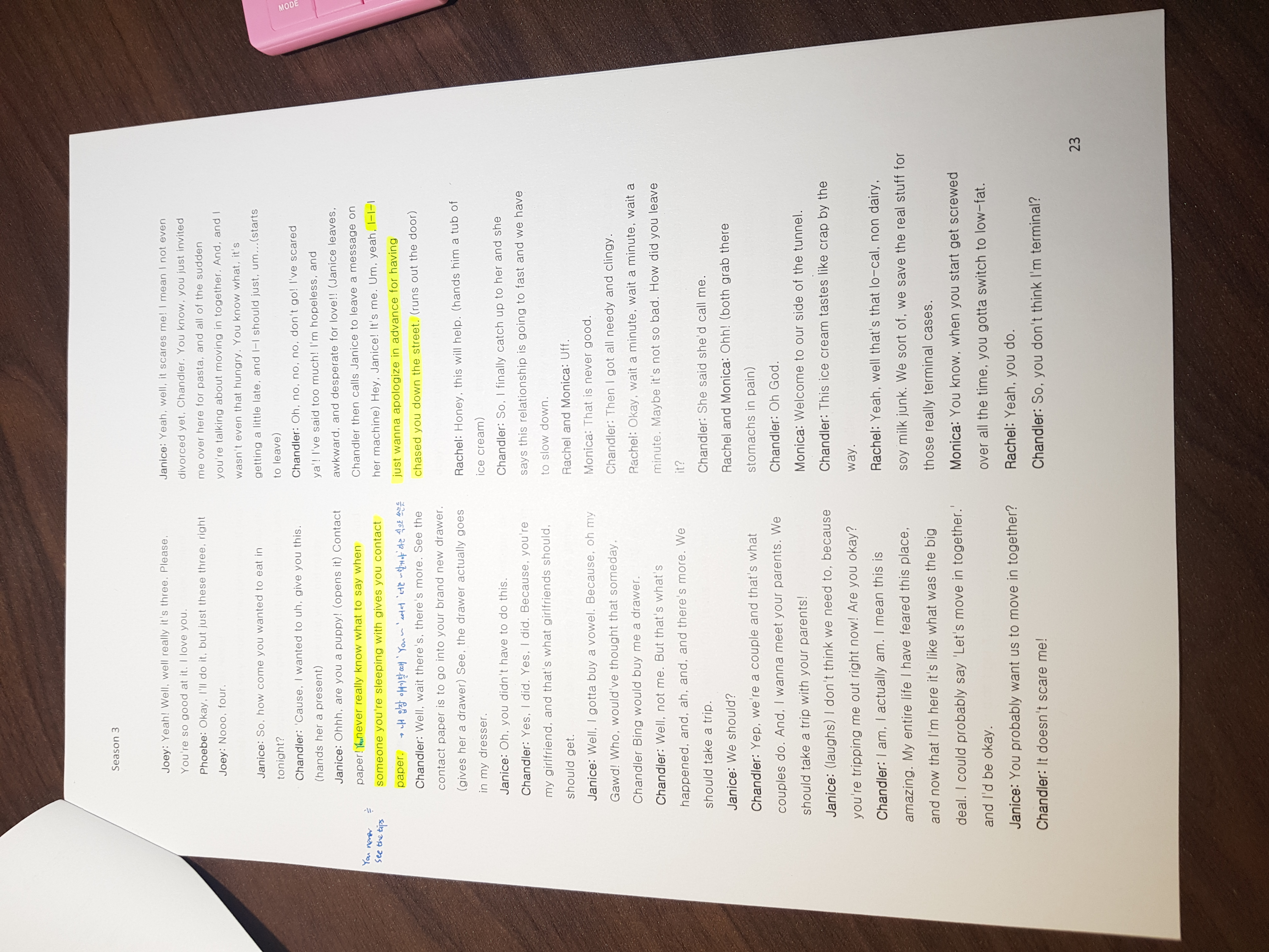 <미드 프렌즈 시즌1 에피소드11 라이팅> 여태까지 문장을 변형해서 공부했는데 안 볼 것 같아서 이제는 그냥 스크립트에 있는 문장만 적어두고 진짜로 실제 사용할 수 있는 문장 몇 개만 가져가겠다 계속 듣고 말..