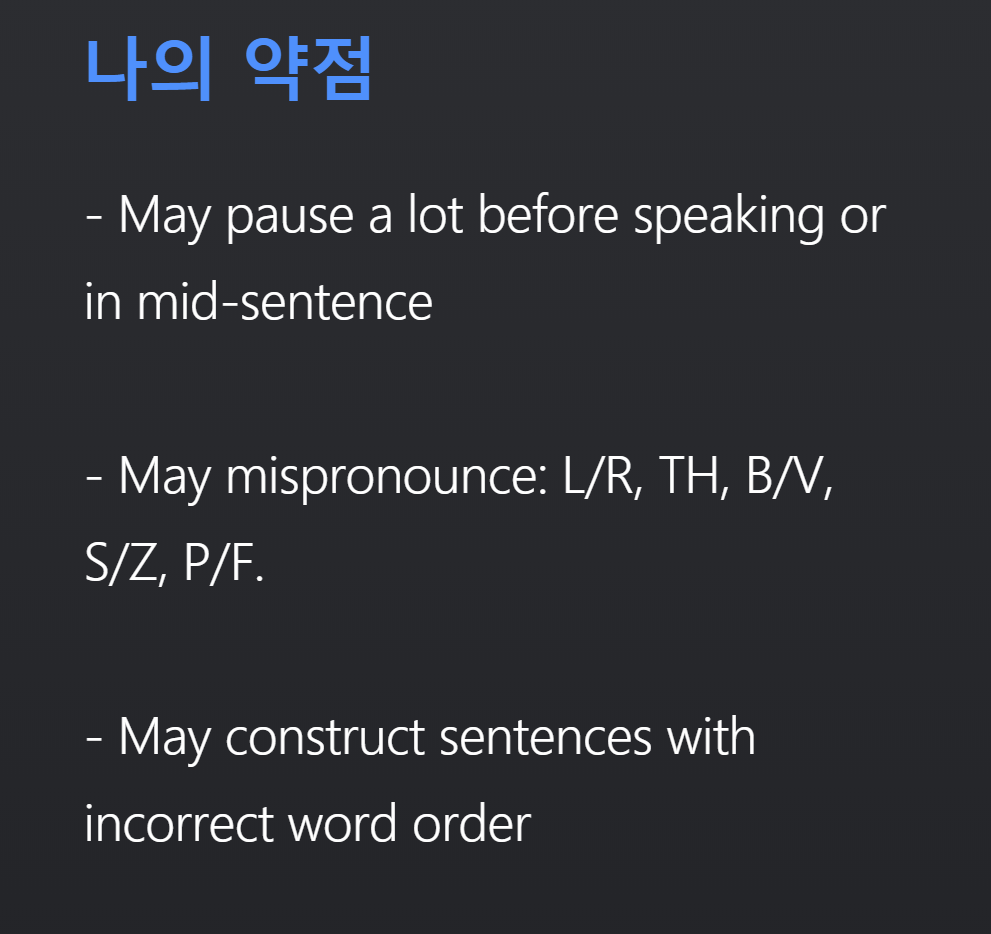 자신감과 리스닝은 조금 되고 노력이 가상하다는 점이 나의 강점이군.