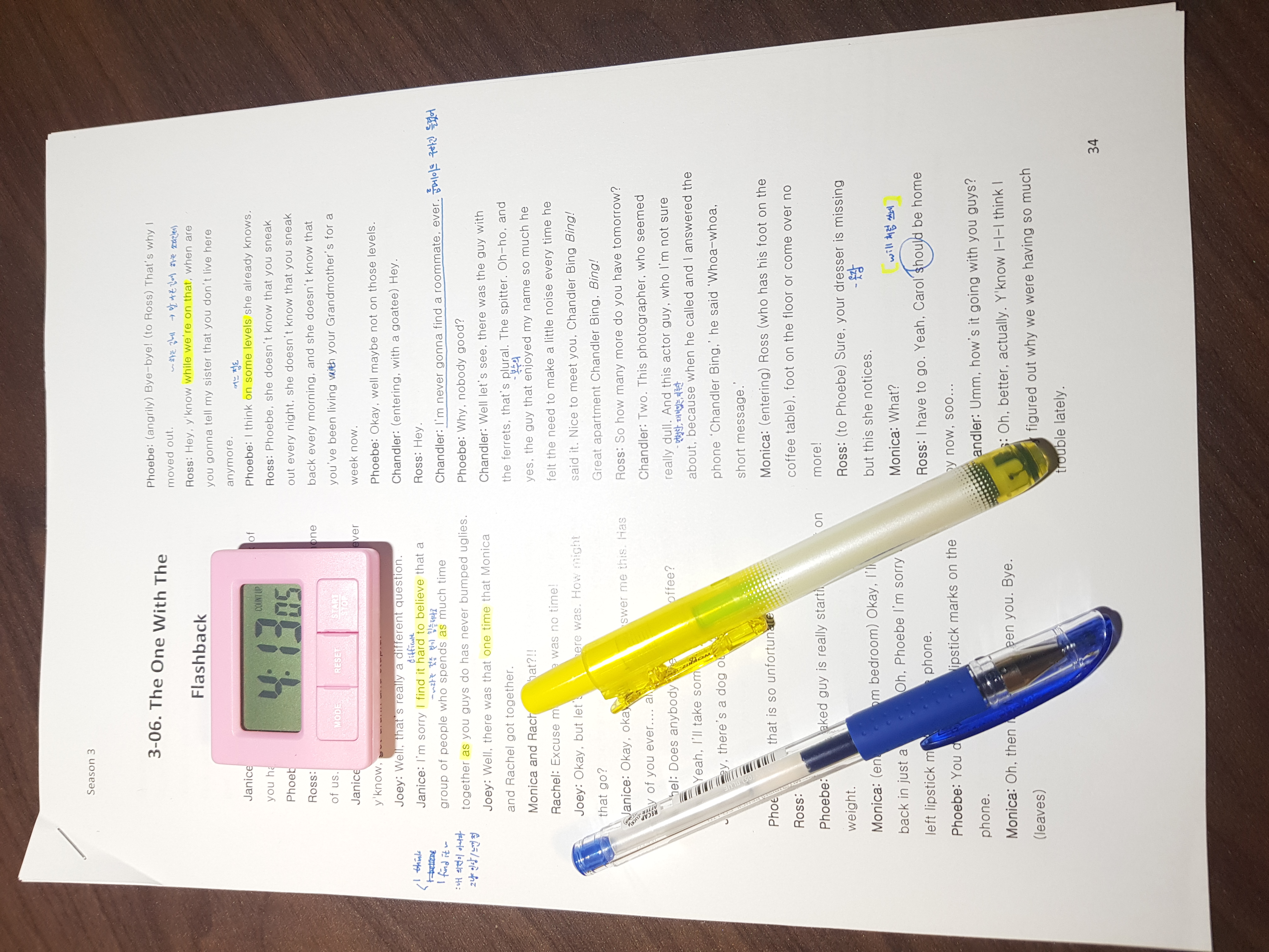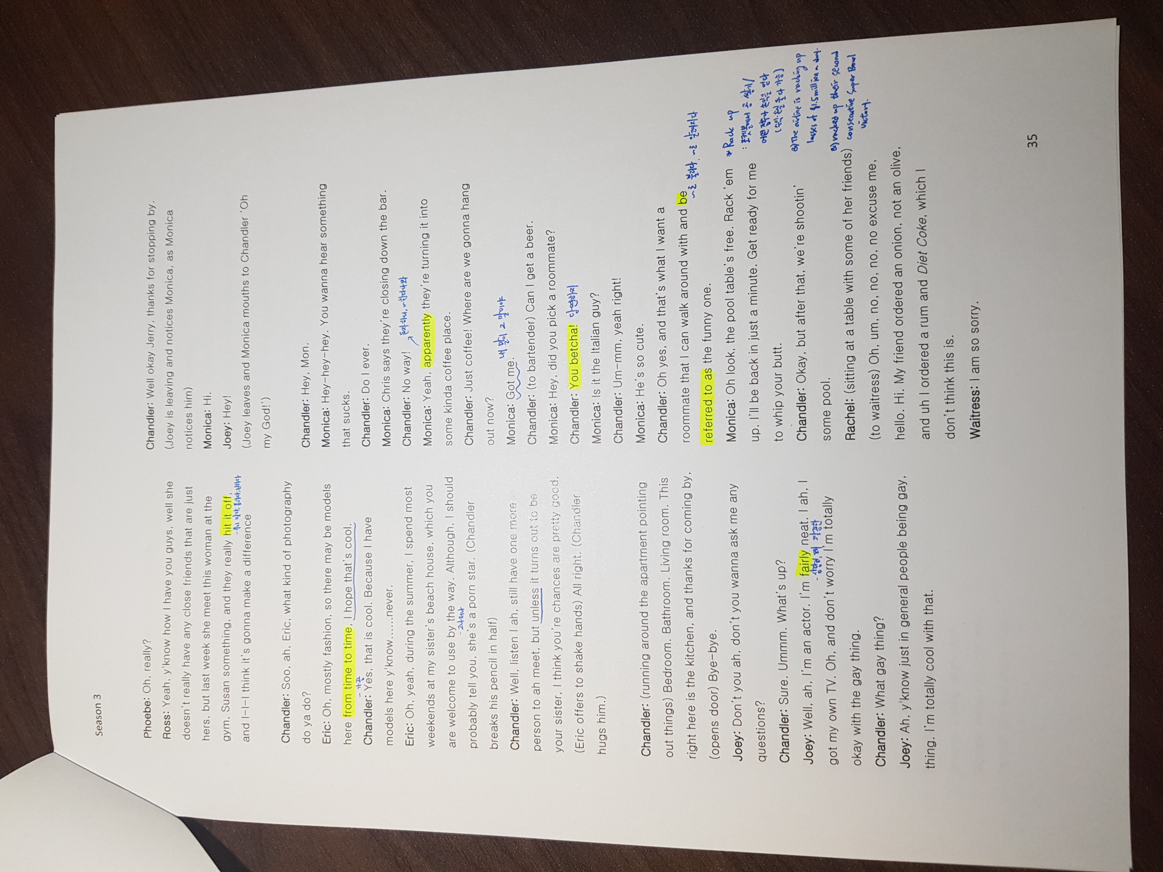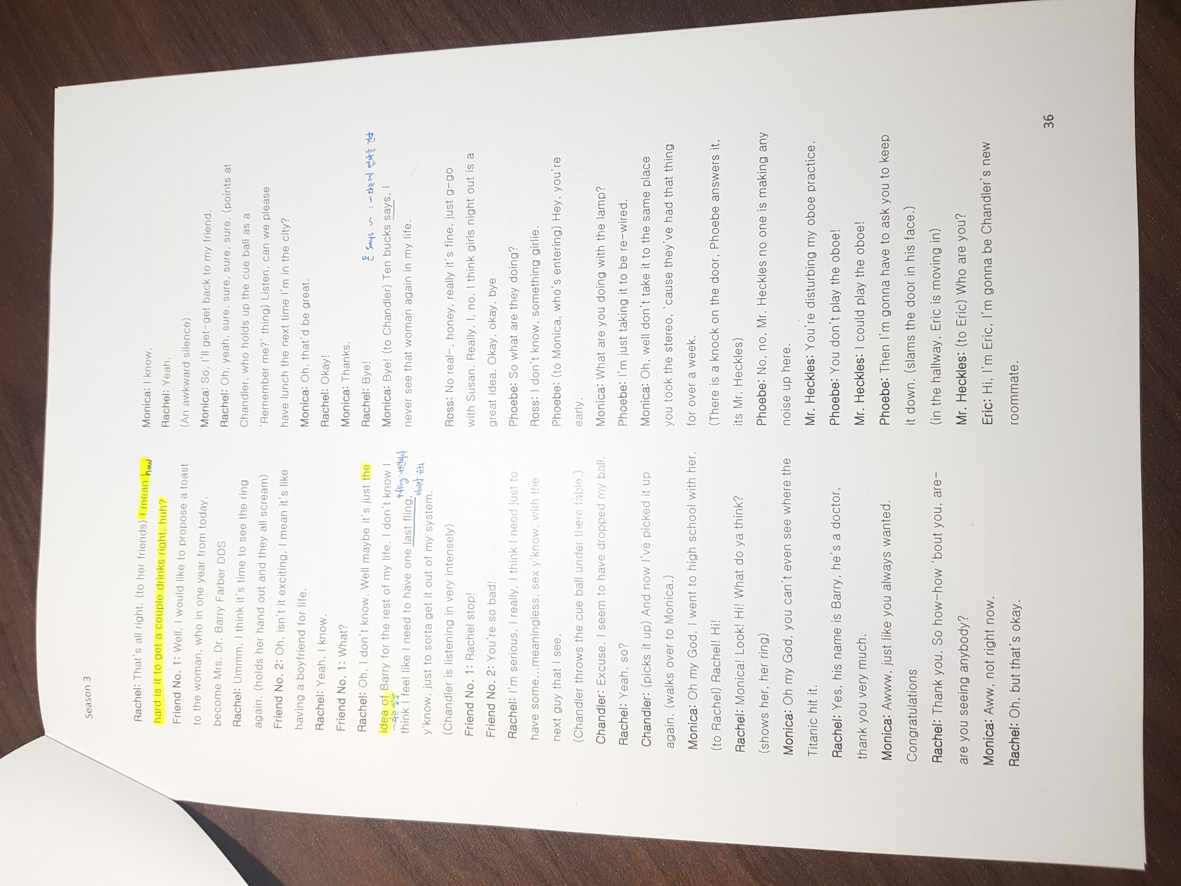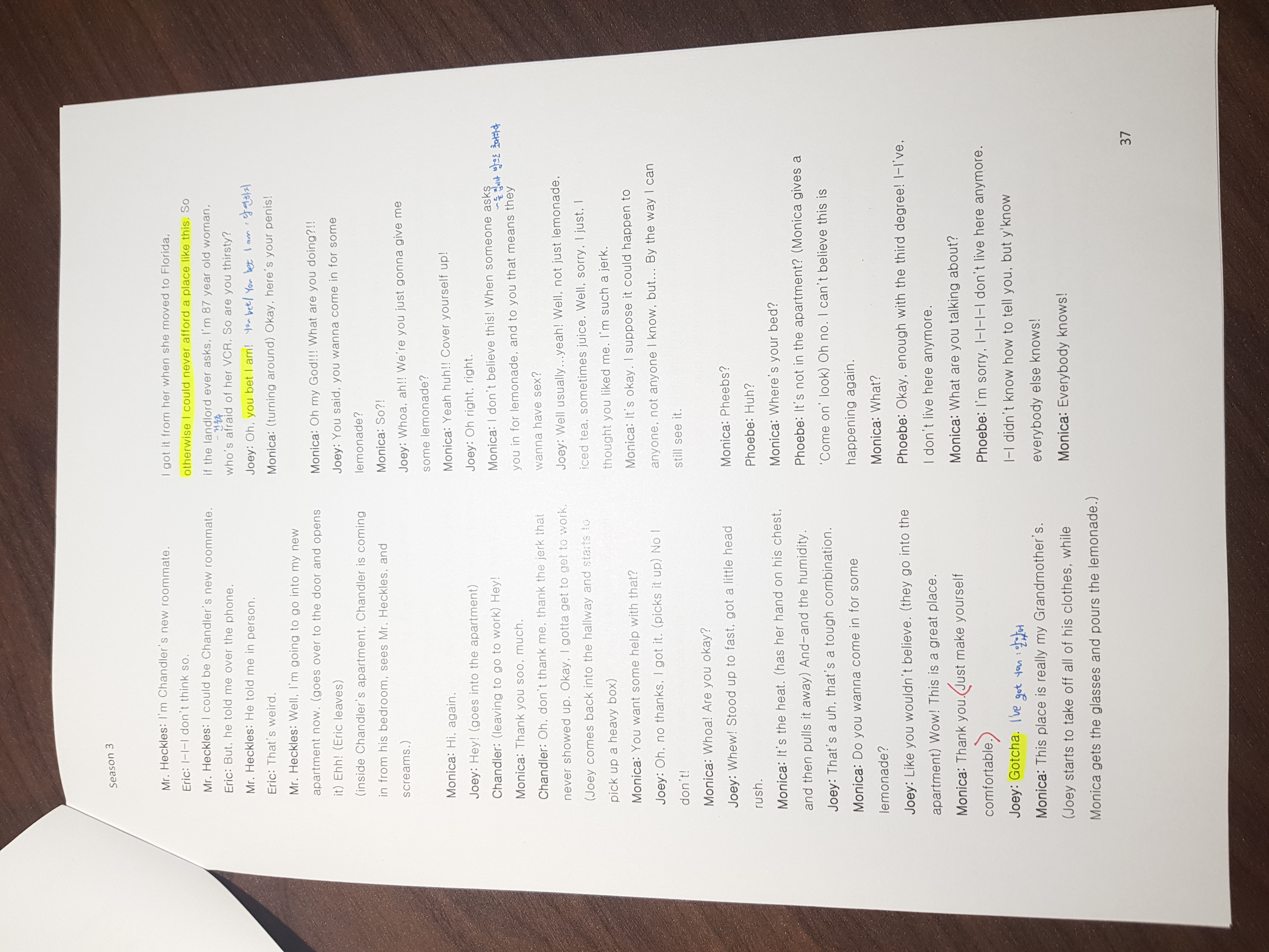 <미드 프렌즈 시즌2 에피소드05 라이팅> 여태까지 문장을 변형해서 공부했는데 안 볼 것 같아서 이제는 그냥 스크립트에 있는 문장만 적어두고 진짜로 실제 사용할 수 있는 문장 몇 개만 가져가겠다 계속 듣고 말..