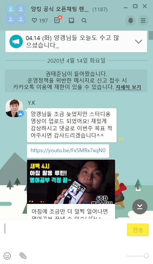 오늘 양킹 유튜버님의 오픈채팅방에 들어갔다.