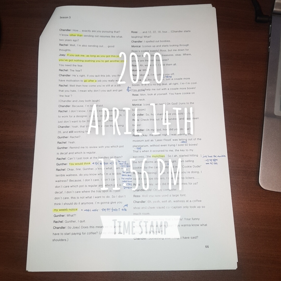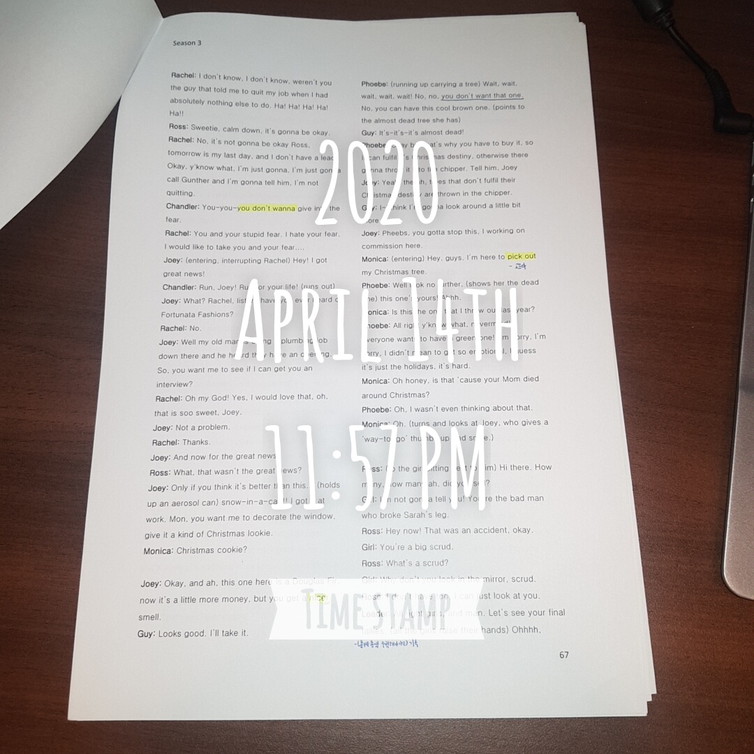 <미드 프렌즈 시즌2 에피소드08 라이팅> 여태까지 문장을 변형해서 공부했는데 안 볼 것 같아서 이제는 그냥 스크립트에 있는 문장만 적어두고 진짜로 실제 사용할 수 있는 문장 몇 개만 가져가겠다 계속 듣고 말..