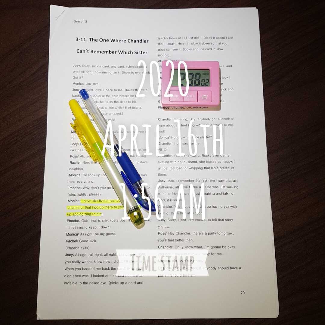 | 일과 : 학교공부+사이버강의+영어회화학원+미드프렌즈쉐도잉 (1) | 2020.04.17 |