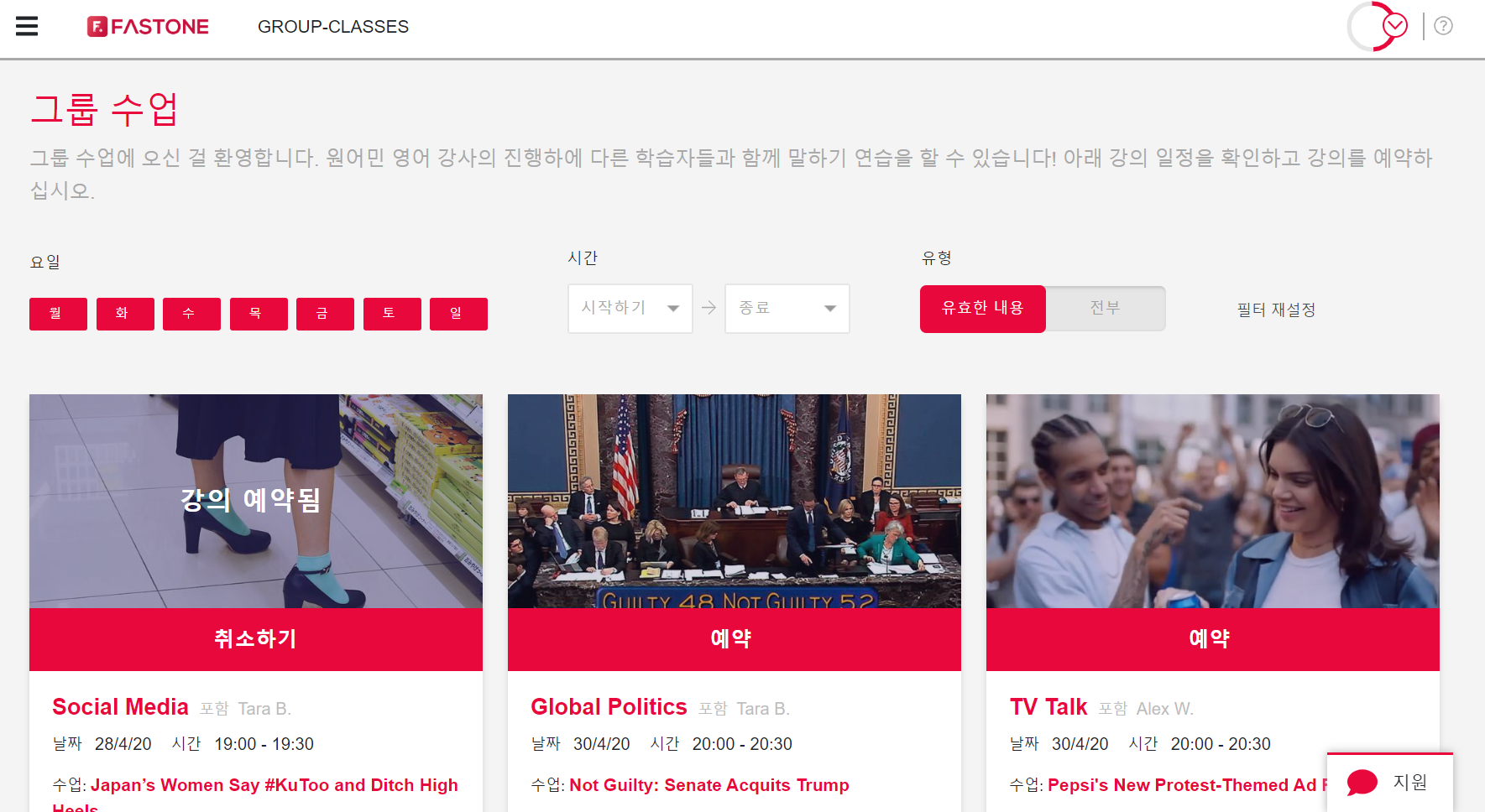 내가 원하는 주제와 시간대를 선택한 다음, 강의를 듣고 나서 수업에 참여하면 된다.