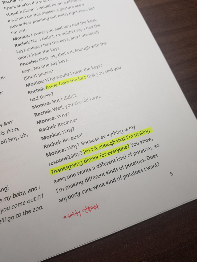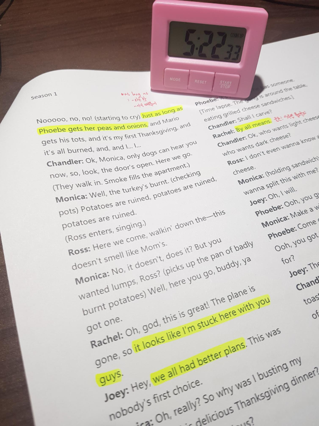실생활에서 쓸 수 있을 법한 표현들은 대본에 형광펜 표시한 후