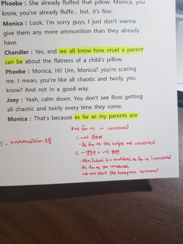 우선 대본의 해당 대사에 형광펜을 쳐두고