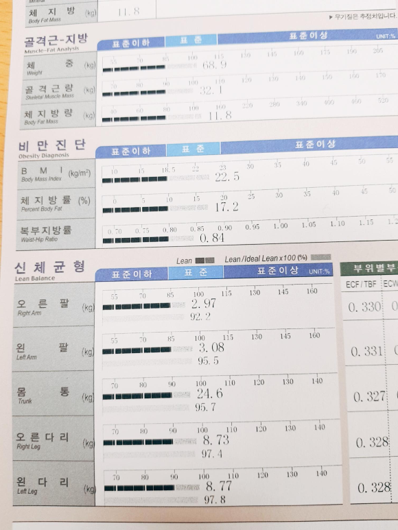 -現) 골격근량 32.1 / 체지방량 11.8 -> 後) 골격근량 34 / 체지방량 9 이하