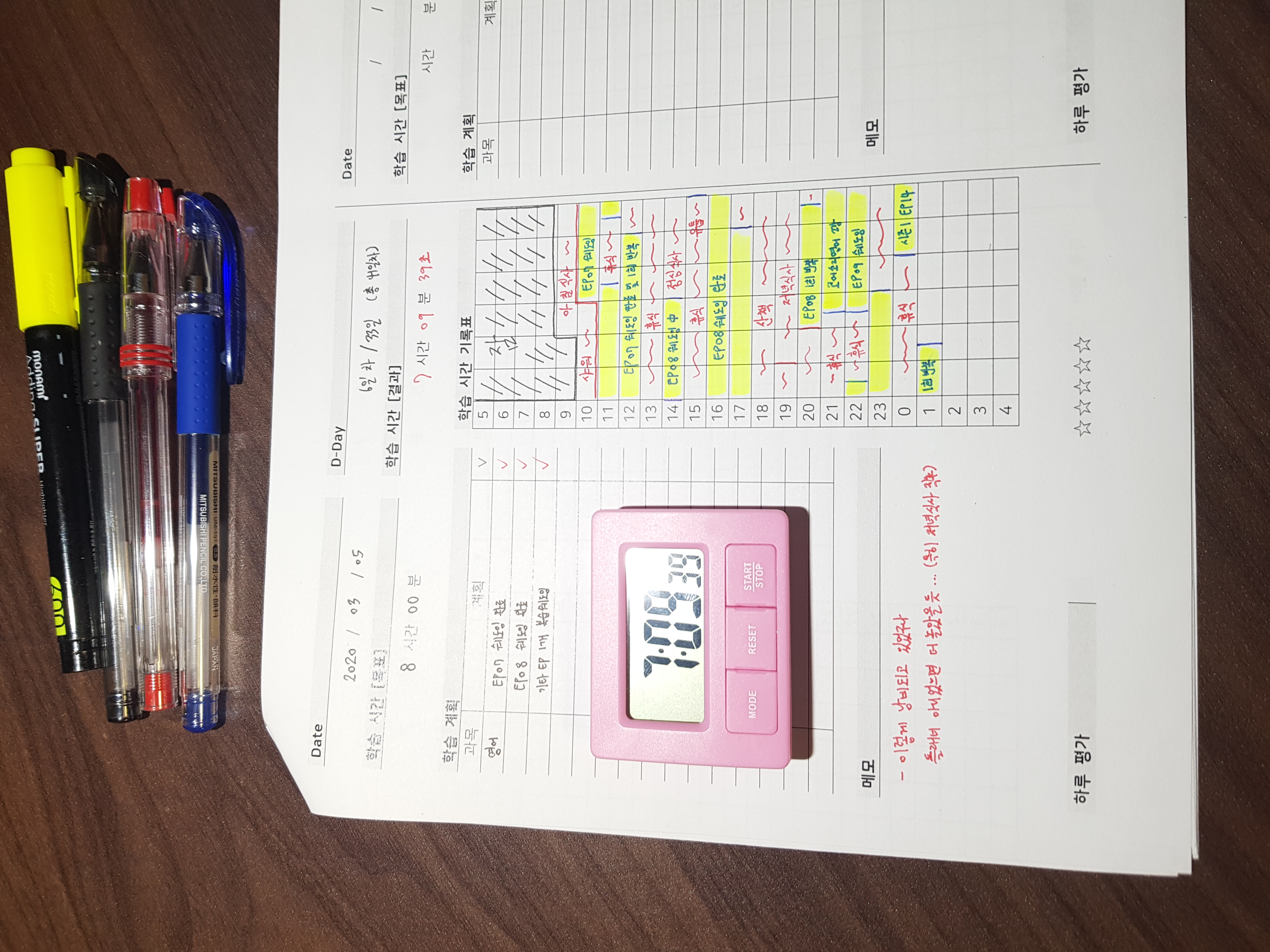 오늘은 학습플래너 양식을 프린트해서 오늘 무엇을 했는지 시간별로 정리하였다.